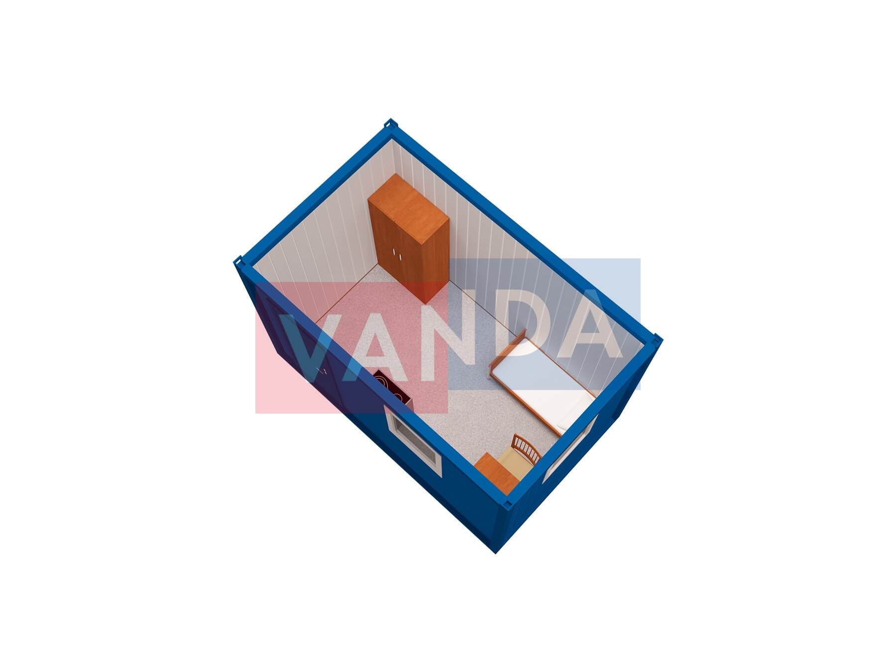 Синяя евробытовка с двуми окнами №1 (вариант 1) изготавливается из несущего каркаса (верхняя и нижняя обвязка): швеллер 120х50х3 мм. или 140х50х3 мм., угловые стойки: сложно - гнутый угол 90х90х3 мм. или 150х130х3 мм., крыша блок-контейнера: металл сварной 0,9-1 мм., качественная наружная отделка: сэндвич панели, внутренняя отделка стен: Сэндвич панели, внутренняя отделка потолка: Панели ПВХ, лаги пола: обрезная доска 40х150 мм., лаги потолка: обрезная доска 40х150 мм., выполнено утепление: Минеральная вата «ISOVER» – 50 мм. и пароизоляция: изоспан А, В, черновой пол состоит из: обрезная доска 20 мм. (2 сорт), чистовой пол покрыт: ДСП строительное 16 мм., отделка пола: линолеум полукоммерческий. Контейнер комплектуется окнами: ПВХ однокамерное, одностворчатое, п/о 900х1100, входной дверью: металлическая, утеплённая (Россия) и внутренними дверями: МДФ (при наличии перегородки). Если в БК присутствуют перегородки, то делается: каркас из бруска 40х50 мм., обшит с двух сторон панелями ПВХ. В блок контейнере есть электро-обеспечение: электрика в кабель канале с УЗО.